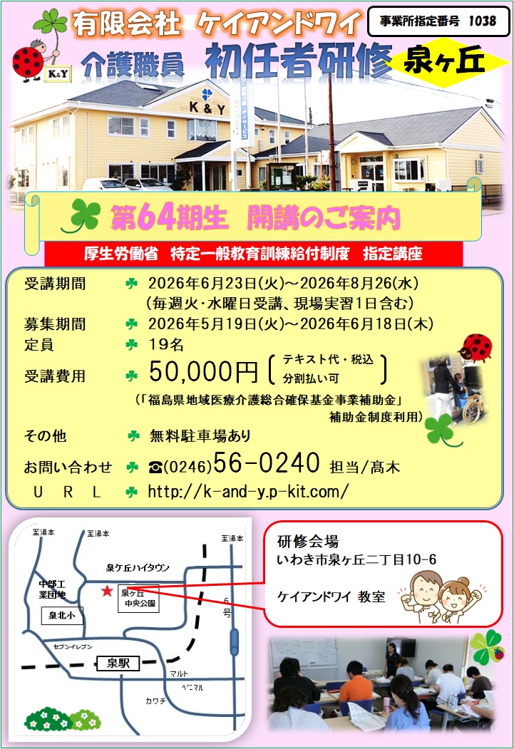 事業所名称 住所等 | ケイアンドワイ介護職員初任者研修 〒971-8171 福島県いわき市泉ヶ丘2-10-6 |